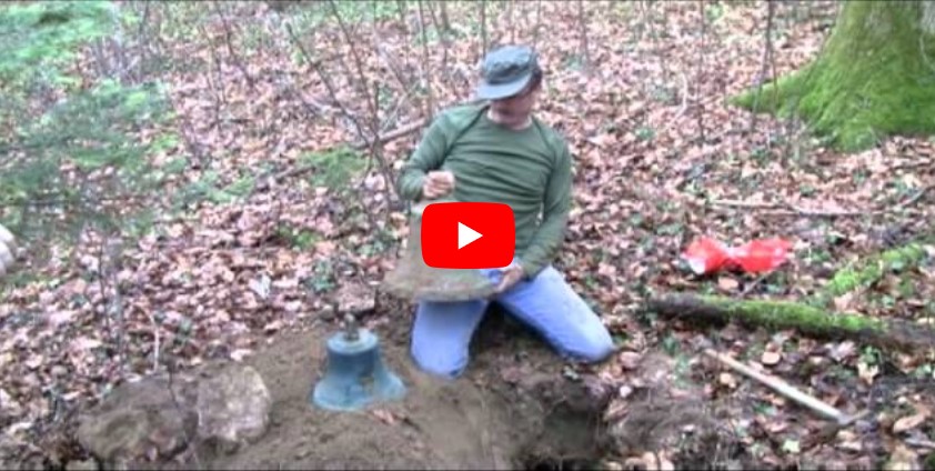 Ein Sondengänger findet mit seinem Metalldetektor zwei alte Glocken im Wald.